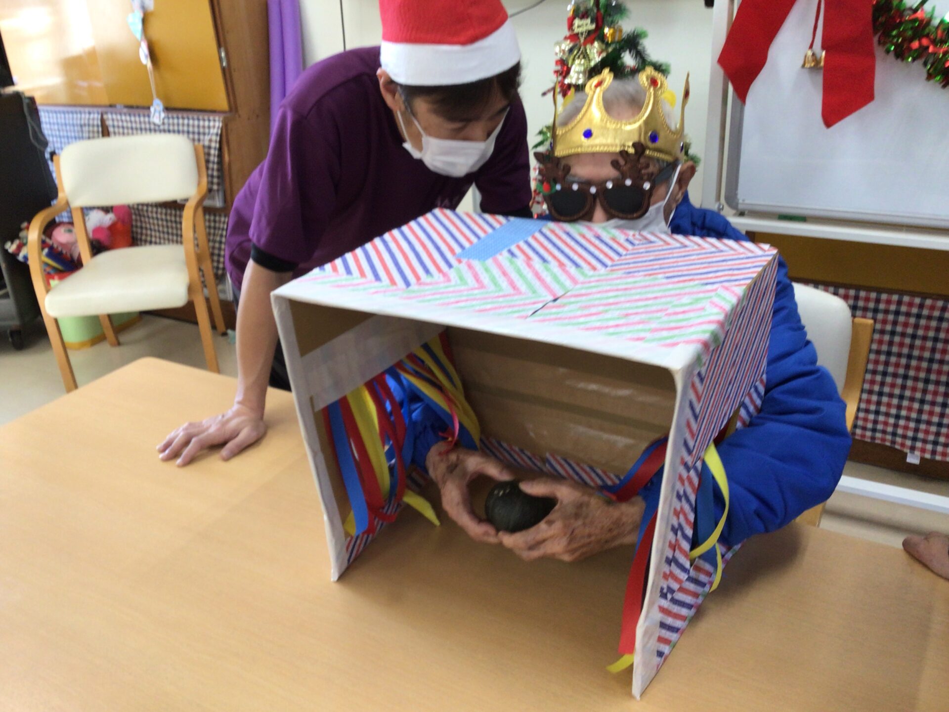 目隠しをして箱に手を入れて中身を当てます。慎重な人や豪快に手を突っ込む人など皆で大騒ぎしました