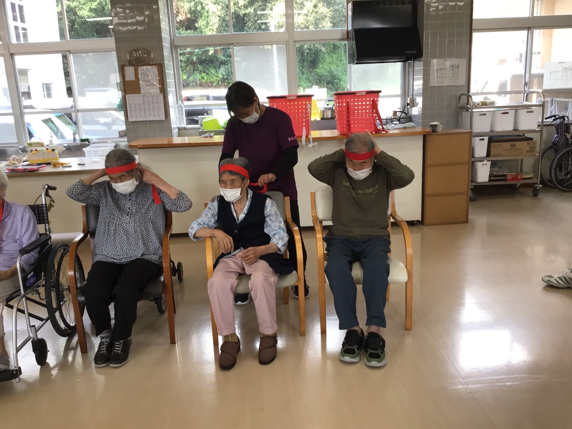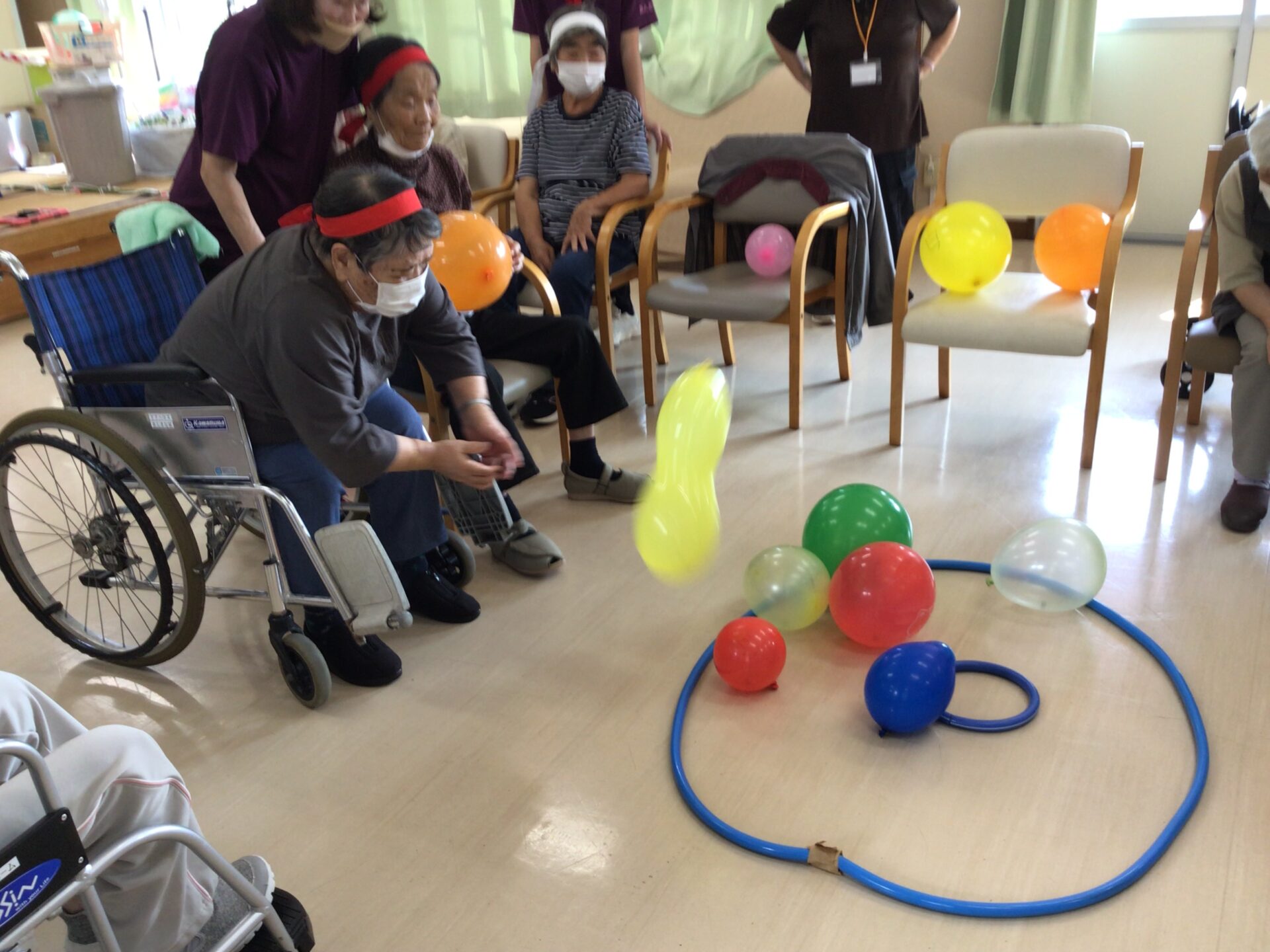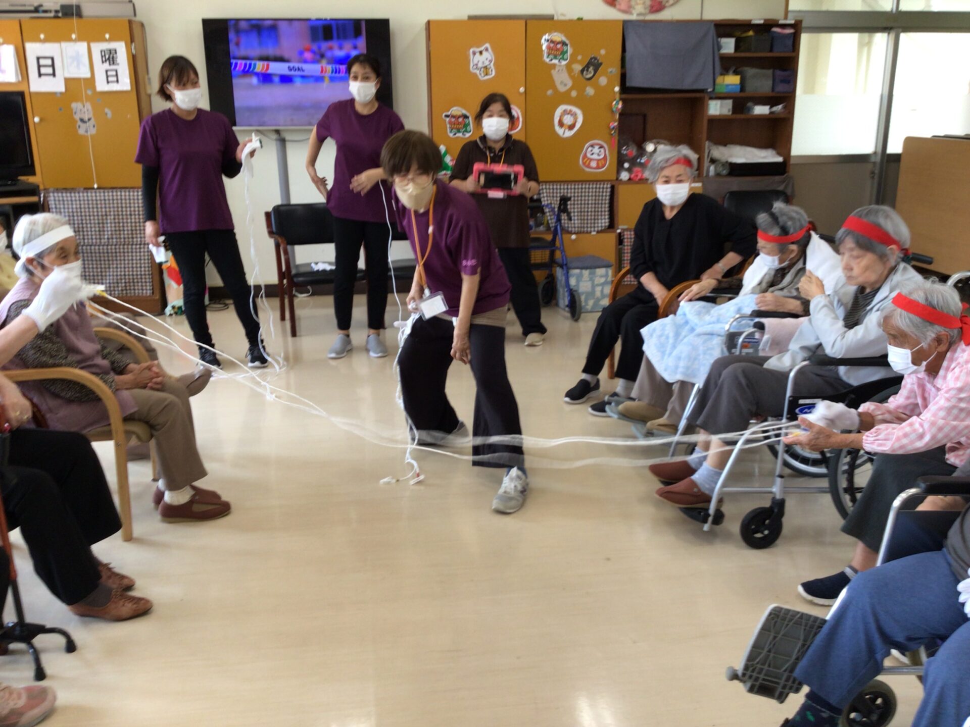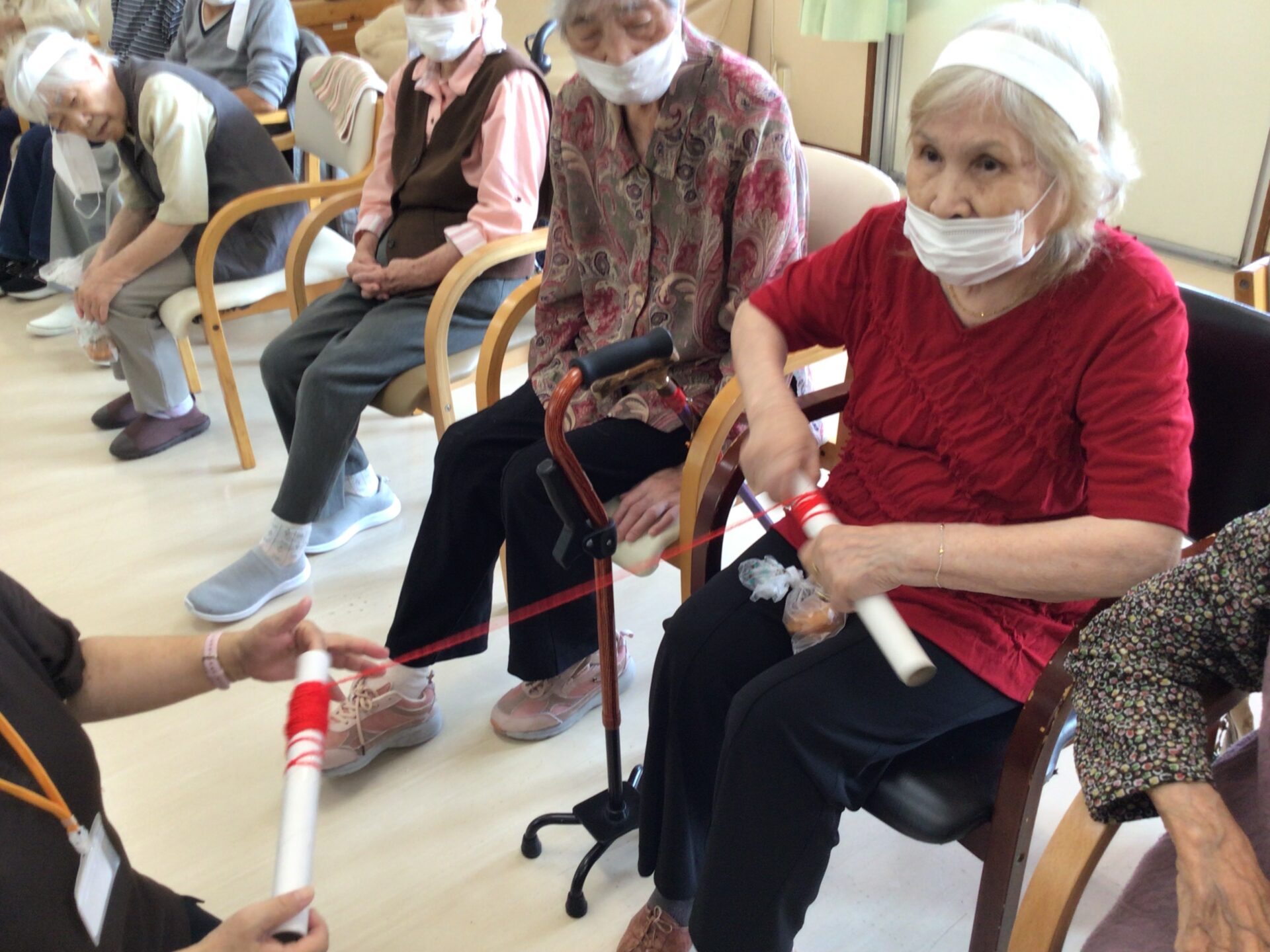 運動会&誕生日会🎂 デイ☆GH合同 毎月恒例のお誕生日会🎉 今月は百寿の方を含め3名のお誕生日をお祝いしました🎂 その後は運動会赤白に分かれて気合十分です! まずは玉入れ!! 風船カーリング!! 糸巻きリレーに 軍手綱引き 大接戦でした。 パン食い競争はとても白熱しました。 最後は皆で美味しくいただきました😋😋 今年も無事みんな元気に運動会を開催できました!! (人”▽`)ありがとうございます☆