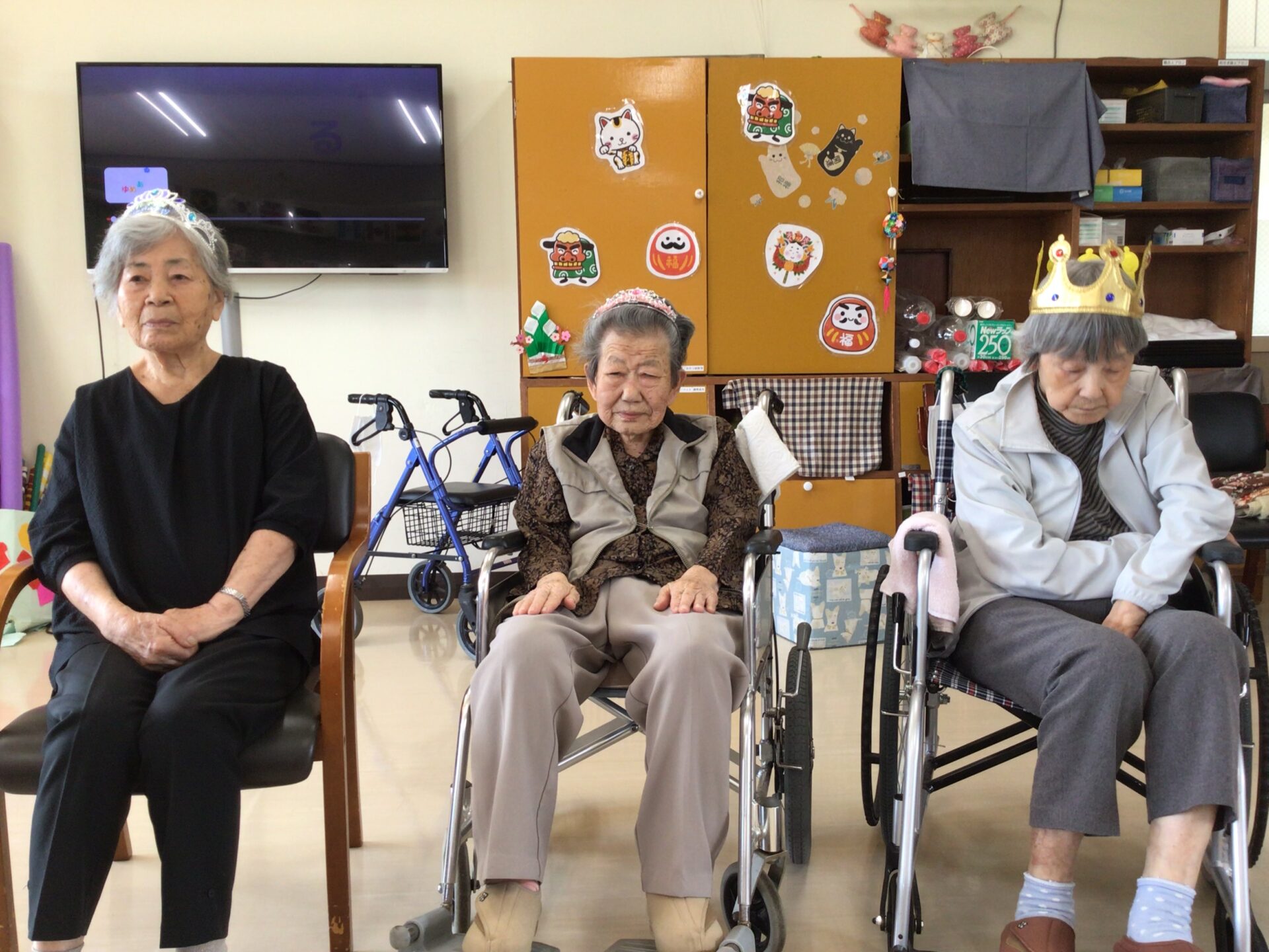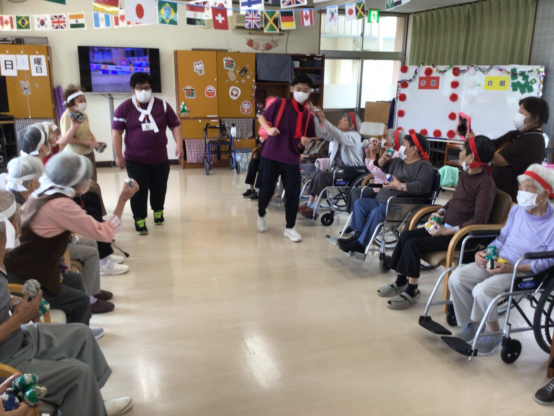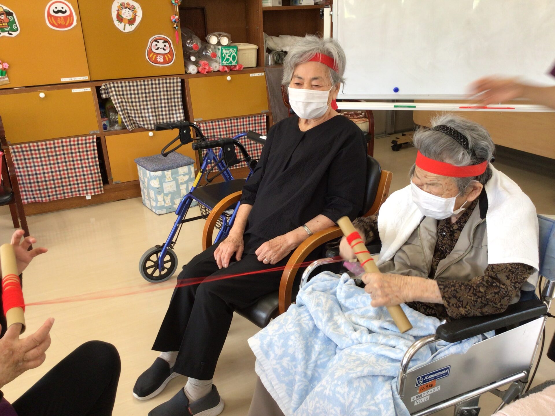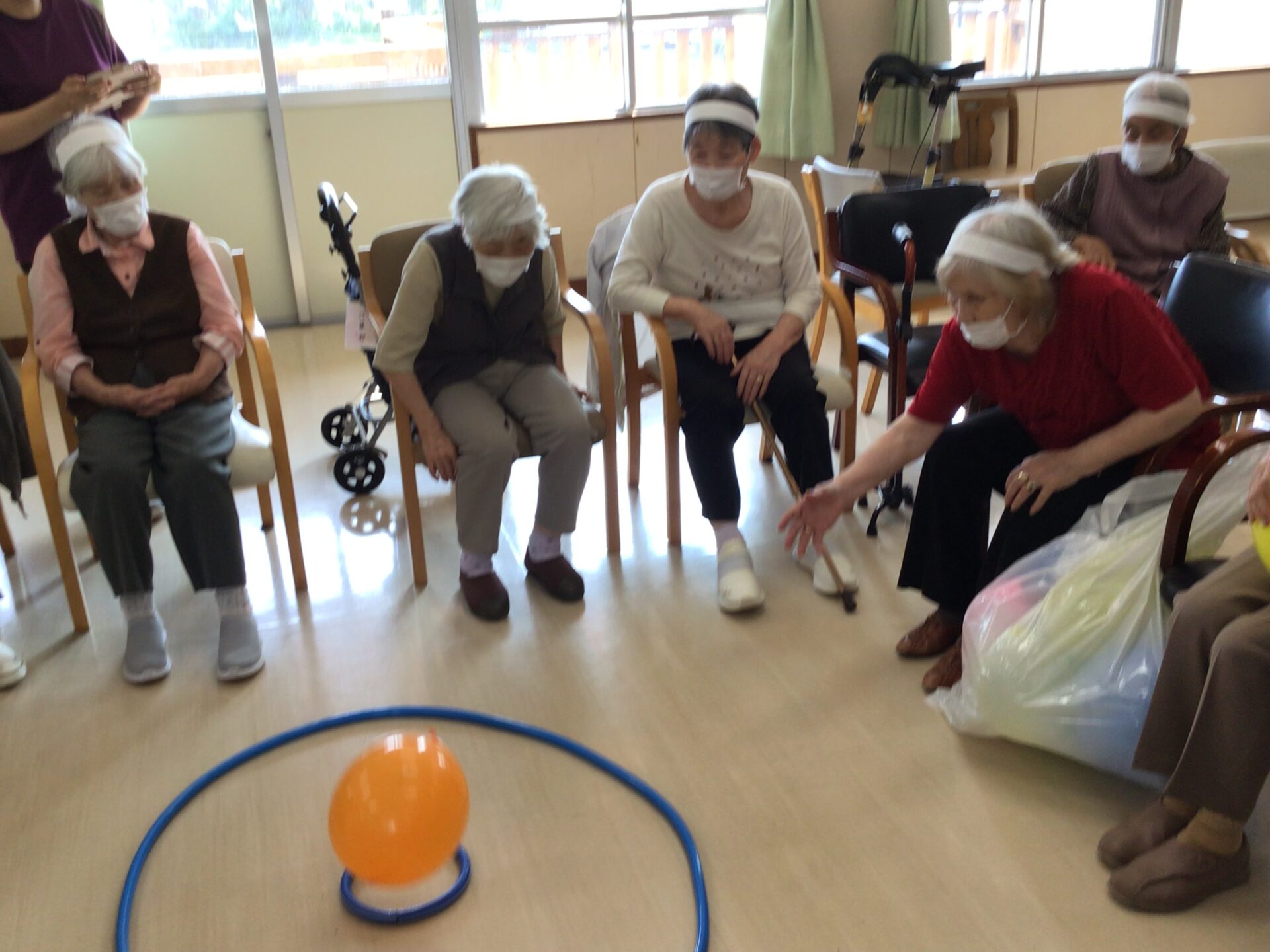 運動会&誕生日会🎂 デイ☆GH合同 毎月恒例のお誕生日会🎉 今月は百寿の方を含め3名のお誕生日をお祝いしました🎂 その後は運動会赤白に分かれて気合十分です! まずは玉入れ!! 風船カーリング!! 糸巻きリレーに 軍手綱引き 大接戦でした。 パン食い競争はとても白熱しました。 最後は皆で美味しくいただきました😋😋 今年も無事みんな元気に運動会を開催できました!! (人”▽`)ありがとうございます☆