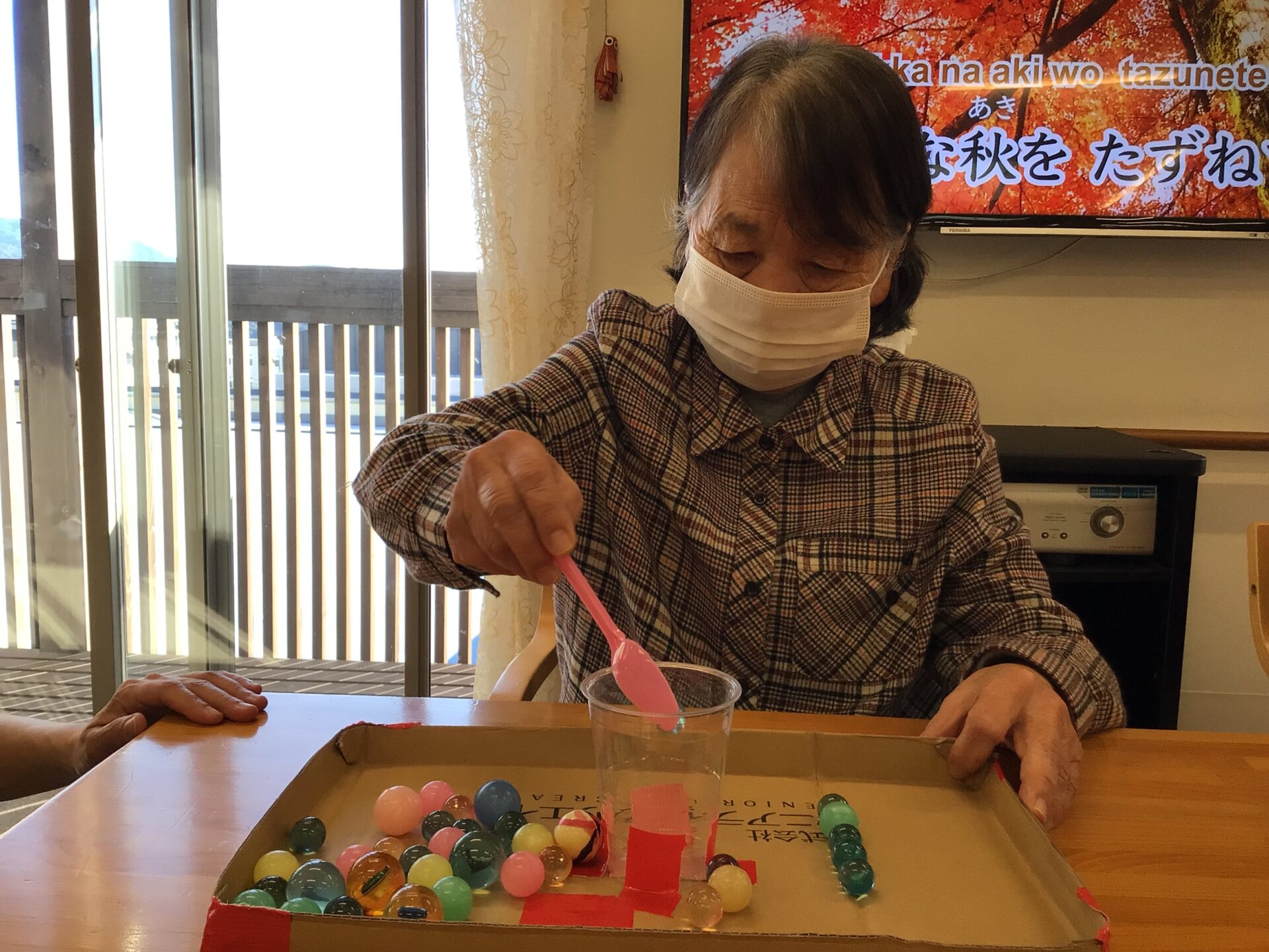小さいスーパーボールをスプーンですくいます(*^^*)