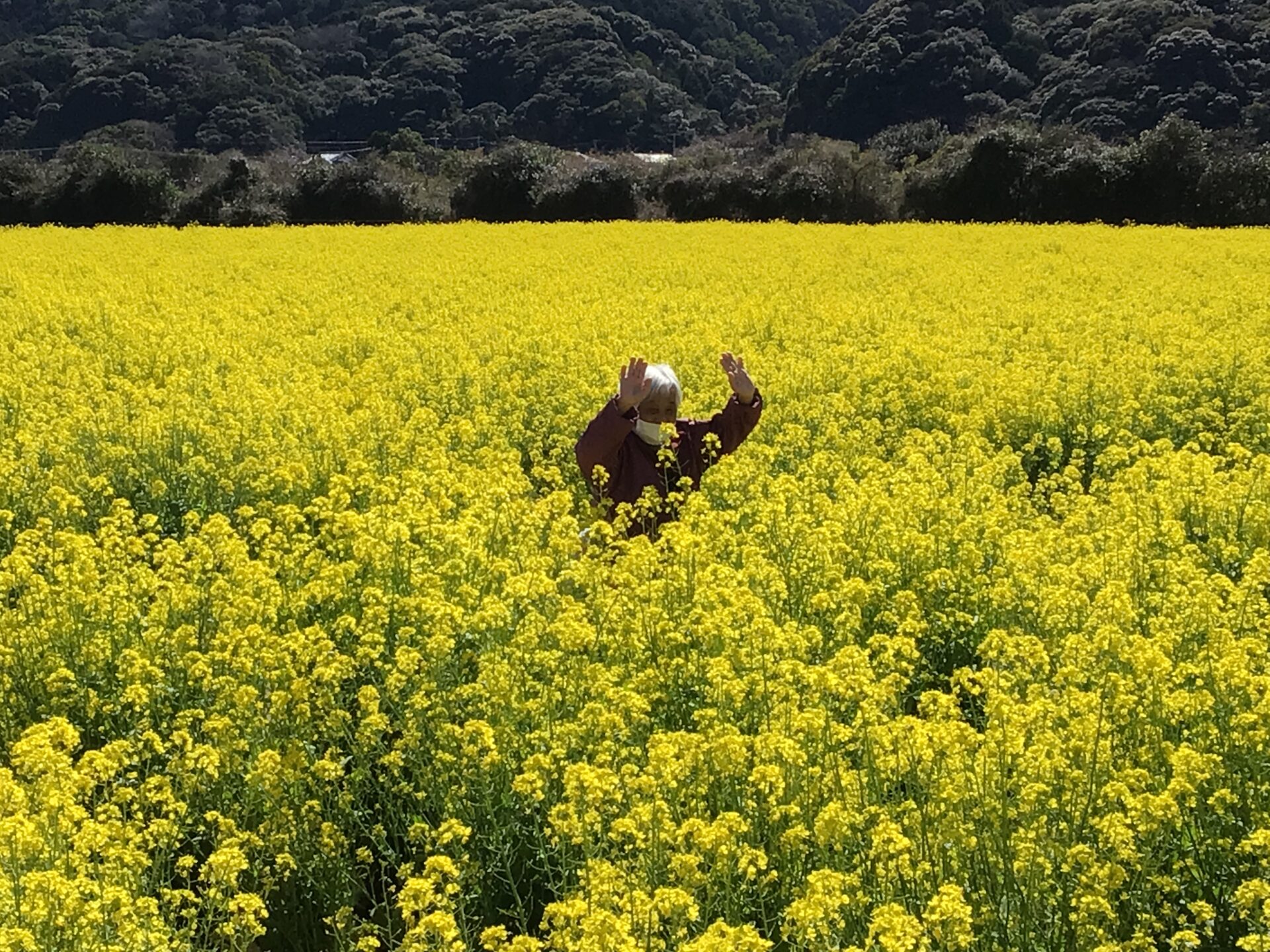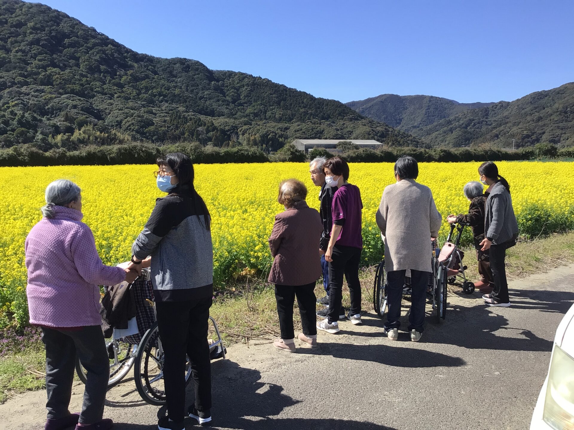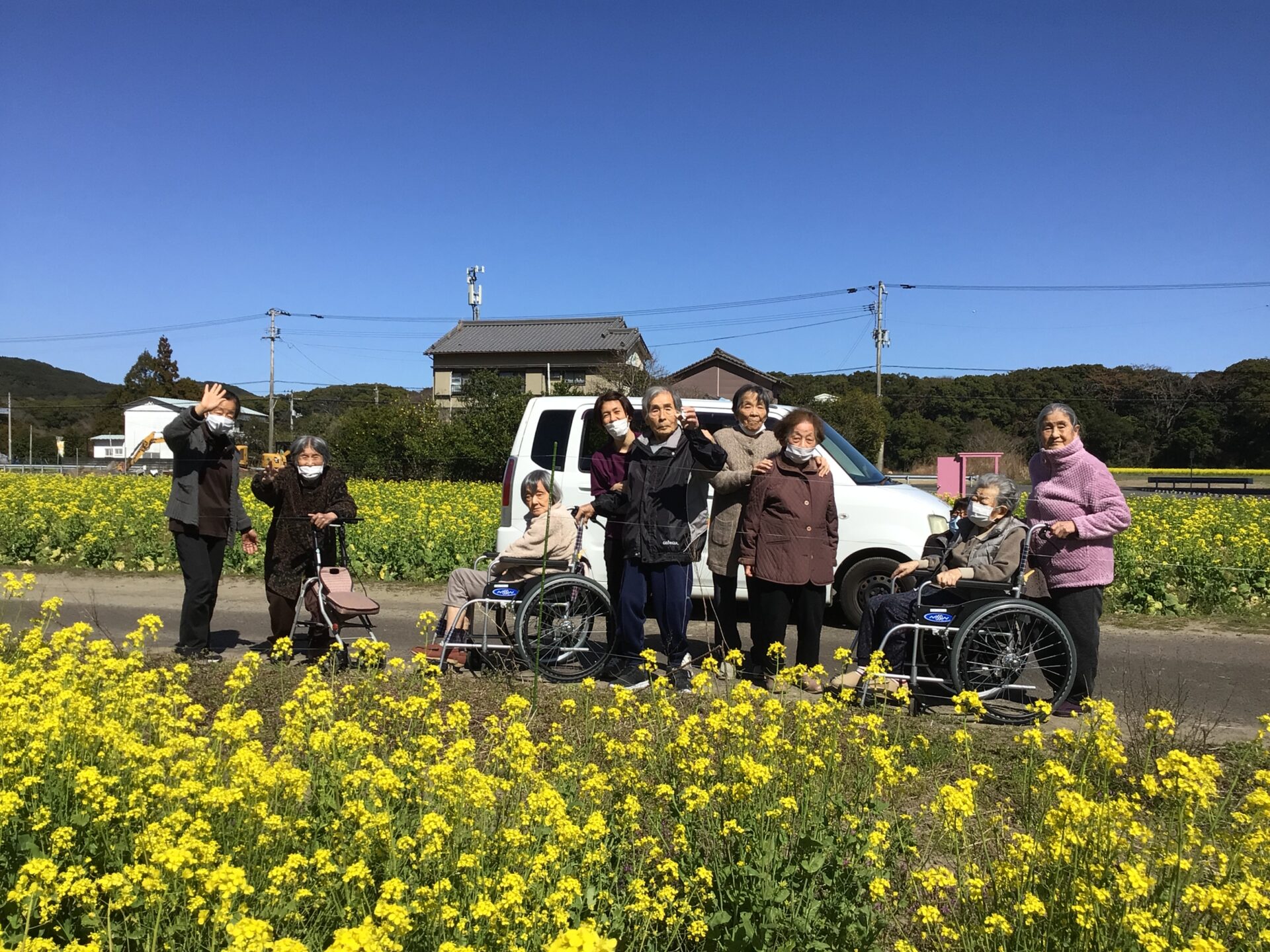 菜の花ドライブ(^_-)-☆ グループホーム本日は、天気も良かったので大岐までドライブに行ってきました(^^♪ 「まっ黄色!(^^)! 絨毯を敷き詰めたみたいな」 「私、わかる?」 花畑からにょっきり(#^^#) 最後はみんなそろって、記念撮影📷パシャリ!!