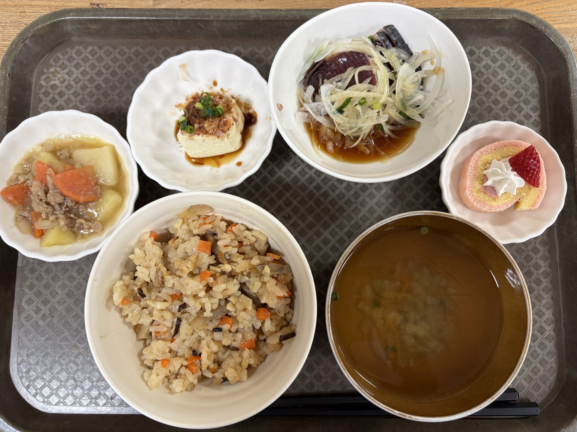 ・炊き込みご飯・鰹のたたき・肉じゃが・湯豆腐