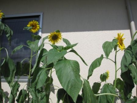 6月上旬から植え始めたゴーヤが、ぐんぐん伸びて成長しています(^0^)見るたびに成長しているので、毎日の観察が楽しみです!!お隣のひまわりたちも元気よく咲いています(:0:)