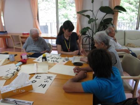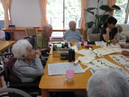 本日はケアハウスでみなさん習字を楽しまれました(^8^)みなさん、字がお上手で・・・職員も負けてはいられません!!出来上がった作品は廊下やお部屋のほうに飾らせていただいております。