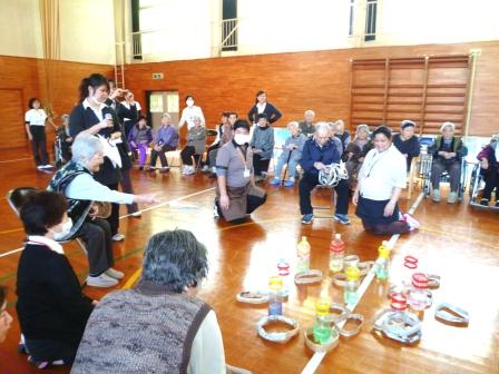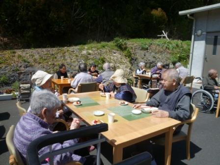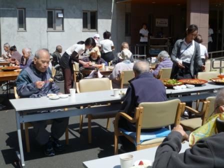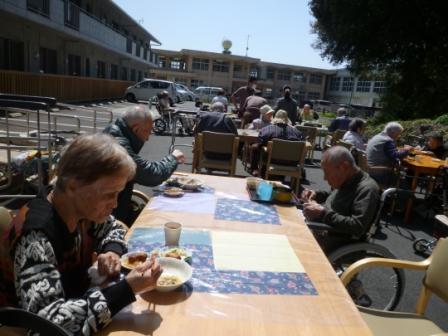 3月25日はいい天気になり予定していた屋外でのバイキングが開かれました。ケアハウスの玄関先に机を並べて久しぶりの外での食事となりました。「外での食事は最高!」という声や「やっぱり外は気持ちいいねぇ~」といった声が聞かれました。食事が済んだら元気な利用者様は体育館に移動して輪投げ大会に参加され楽しまれていました。これから更に暖かくなるのでできれば屋外での活動を増やしていきたいと思います。