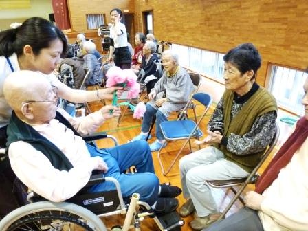 最後に母の日ということもあり皆でつくったカーネーションが男性利用者様から女性利用者様へ手渡されはすかしがるかたもいました(*^_^*)