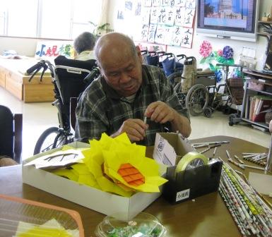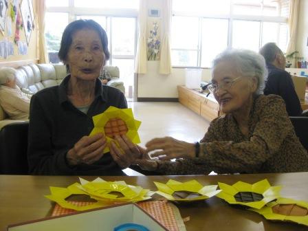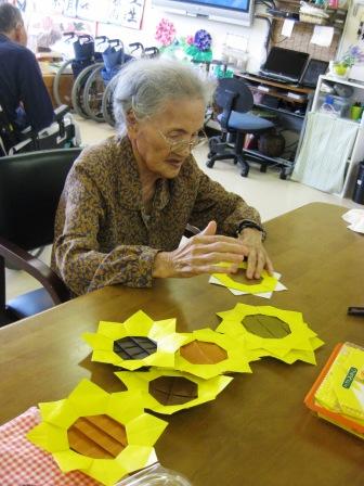 午後からのレクでは折り紙でヒマワリの花作りに挑戦(*^_^*)(*^_^*)