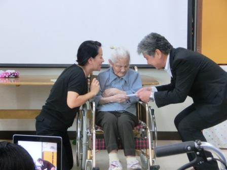 泥谷市長よりご祝辞をいただいた後は、お祝いの品と2ショット撮影。本人様もとても喜んでおられました。