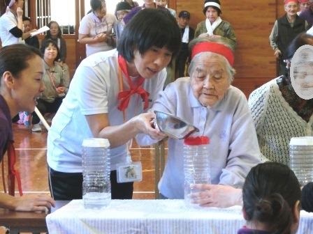 応援に来ていただいた区長さん・民生委員の方に採点していただきました。どこの事業所もこの日のために練習をしてきてくれており、どれも楽しい応援合戦でした。