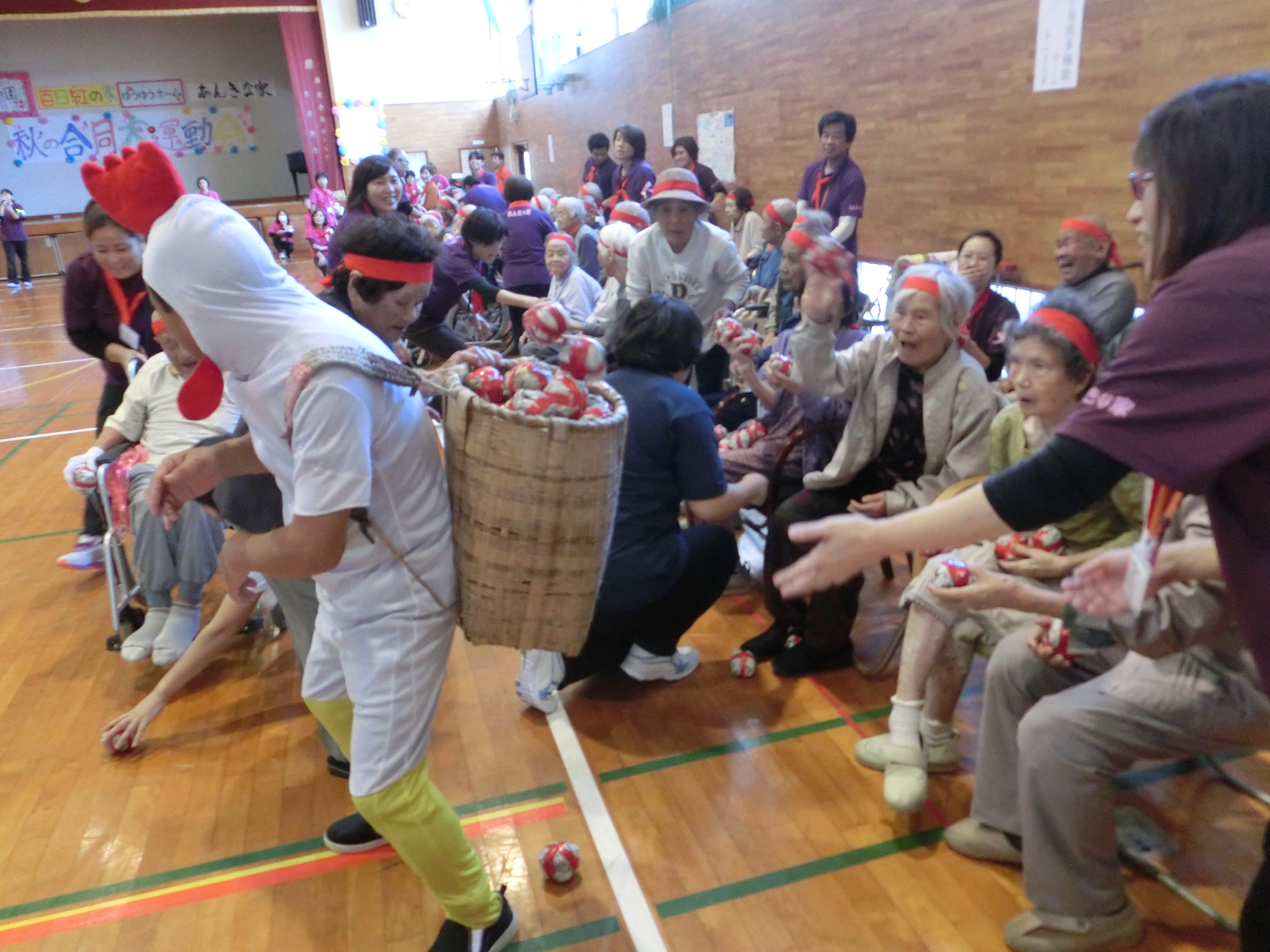 玉いれ競技では、赤も白もカゴいっぱいまでボールを入れたのですが結果は白組の勝ち!後で「カゴの大きさが違うかった!」と赤組よりクレームがきておりましたが(;-ω-)ゞ