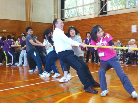 午後1番は職員による綱引きです。利用者以上に燃えているのは職員(´ω`;)みんなすごい真剣な顔してました( *^皿^)