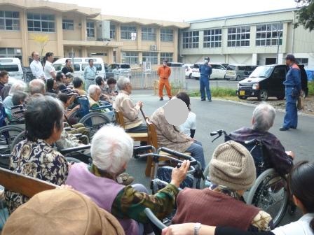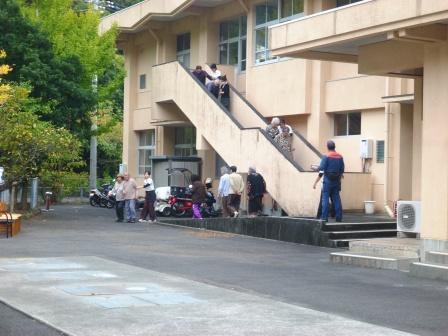 ジリリリリリリィッ!のサイレンと同時に職員も利用者様も急いで避難します。自分で歩ける人は自分で、歩けない人は職員が介助し、無事にみなさん避難できました。