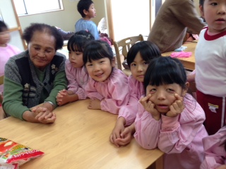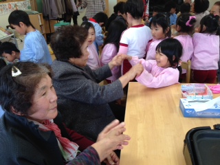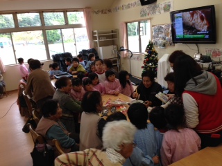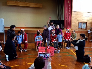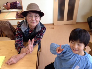 12月16日(火)はみなさん待ちに待った!!しみず幼稚園のみなさんが、学芸発表披露に来てくれました(*^_^*)♪この日は、しみず幼稚園のみなさんが来てくださることもあり、「下ノ加江小方・鍵掛・久百々・以布利・加久見・養老・松崎地区」のご利用者様に集まっていただきました!12月の誕生会にも参加してとっても楽しい1日を過ごしました!!生きがいデイサービスご利用者様と曾孫くんです♪〃小さい園児さんは一足先に園に帰られましたが、大きい園児さんたちは残って一緒にゲームをしてくれました(^_^)衣装からいつものユニホームにチェンジ!!!