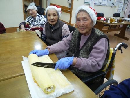 出来上がったロールケーキを利用者様に切って頂きま~す\(^o^)/