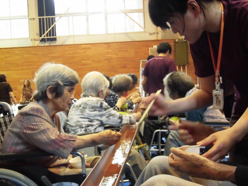 そうめん流し\(^o^)/皆さん全員一緒にたべることはできないので、舞台の上ではカラオケ大会をおこないました。利用者様、職員自慢の声を聞かしていただきました(^_-)-☆