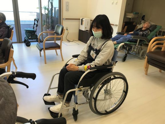まずは車椅子体験で利用者様の気持ちを知ってもらいました・・・