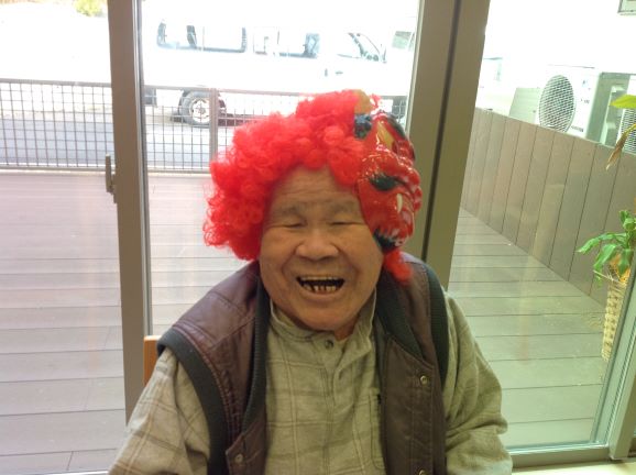 フワフワのカツラとお面をかぶってもらうと、ニッコリ(^^♪
